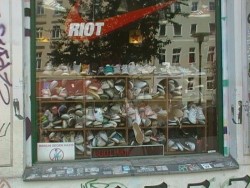 Schaufenster ist vollgestopft mit Schuhen, alles wirr