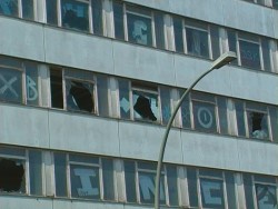 Fensterscheiben von alten Wohnblocks und Bürogebäuden dienen als