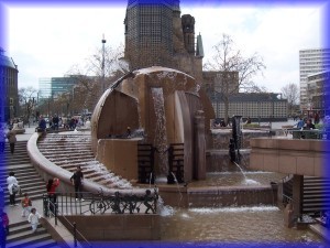 Berlin is short of money. So there's no water for fountains. But the Mayor is always looking for someone to pay the bills. The fountain on Breitscheidplatz is working from spring to fall, thanks to one company or another.