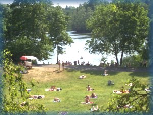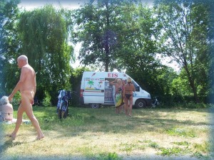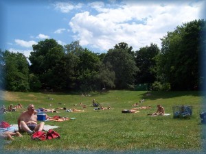 Liegewiese, auf der viel FKK-Betrieb herrscht.