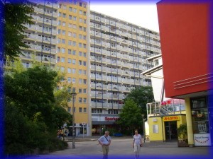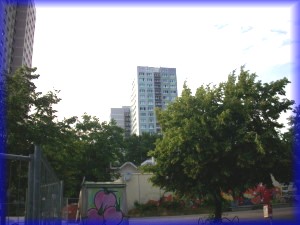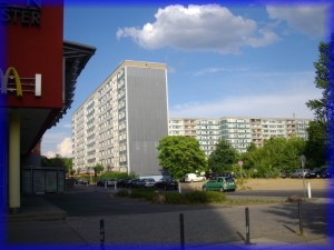 Auf der einen Seite der Straße wohnen die Tiere, auf der anderen Menschen in ihren Plattenbauten. Zum Glück haben sie viele Bäume aufgestellt, man sieht die Mietskasernen kaum.